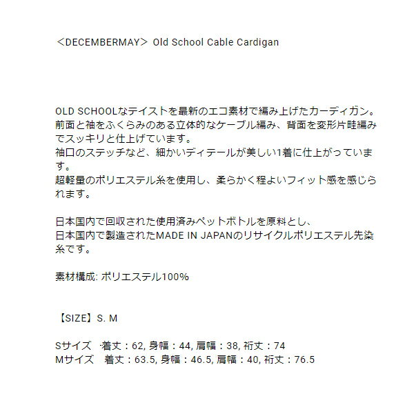 説明 :【Recommended】 OLD SCHOOLなテイストを最新のエコ素材で編み上げたニットカーディガン。 前面と袖をふくらみのある立体的なケーブル編み、背面を変形片畦編みでスッキリと仕上げています。 袖口のステッチなど、細かいディテールが美しい1着に仕上がっています。 超軽量のポリエステル糸を使用し、柔らかく程よいフィット感を感じられます。 日本国内で回収された使用済みペットボトルを原料とし、日本国内で製造されたMADE IN JAPANのリサイクルポリエステル先染糸です。 日本製 made in JAPAN 商品名 Old School Cable Cardigan / WOMAN 商品番号 2-305-1023 サイズ S / 着丈:62, 身幅:44, 肩幅:38, 裄丈:74 M / 着丈:63.5, 身幅:46.5, 肩幅:40, 裄丈:76.5 素材 ポリエステル100% JANコード 4582672325552 4582672325569 対象 レディース 女性用 ( 日本正規品 正規取扱い店 公式取扱い店 ゴルフ アパレル ゴルフアパレル ブランド カッコイイ カッコいい かっこいい オシャレ お洒落 おしゃれ かわいい 可愛い カワイイ ブランド 人気 おすすめ 大人 おとな プレゼント ギフト 誕生日 贈り物 母の日 母の日ギフト ホワイトデー ホワイトデーギフト お返し クリスマス クリスマスギフト レア ゴルフ GOLF ゴルフウェア ゴルフウエア ウェア ウエア レディースウェア レディースウエア レディースゴルフウエア レディースゴルフウェア セーター カーディガン セーターカーディガン オールシーズン対応 大人ゴルフウエア 大人ゴルフファッション 服 ふく トップス アウター ミドル丈 長袖 長そで 無地 軽い 軽量 アクティブ スポーツ トレーニング ファッション 練習 上品 高級 色 カラー 白 ホワイト WHITE 春 夏 春用 夏用 春夏 秋 サイズ S M )