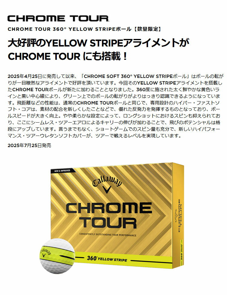 商品名 : ★★予告★1/25限定★★当店エントリー&抽選で最大100%ポイントバック !【オリジナルマークプリントボール(納期2-3日)】キャロウェイ クロムツアー(CHROME TOUR) 360 イエローストライプ ゴルフボール 1ダース (12球入り) 2025年モデル スマイルプリントB マーク入り