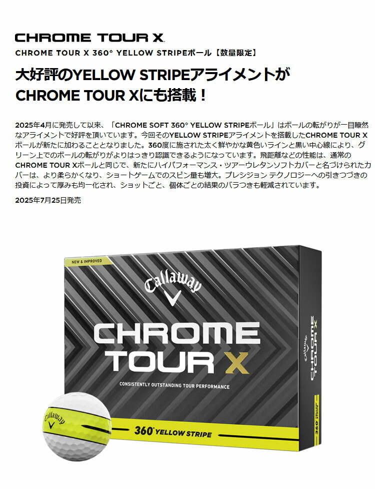 商品名 : 【オリジナルマークプリントボール(納期2-3日)】キャロウェイ クロムツアーX(CHROME TOUR-X) 360 イエローストライプ ゴルフボール 1ダース (12球入り) 2025年モデル バースデイ・メッセージ マーク入り