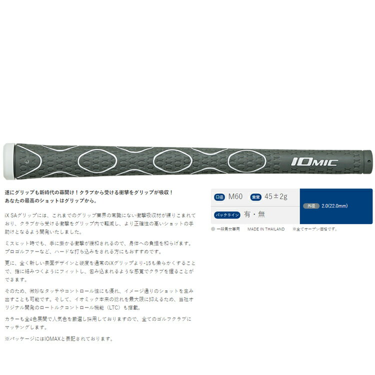 説明 :遂にグリップも新時代の幕開け!クラブから受ける衝撃をグリップが吸収! あなたの最高のショットはグリップから。 iX SAグリップには、これまでのグリップ業界の常識にない衝撃吸収材が練りこまれており、クラブから受ける衝撃をグリップ内で軽減し、より正確性の高いショットの手助けとなるよう開発いたしました。 ミスヒット時でも、手に掛かる衝撃が緩和されるので、身体への負担を和らげます。プロゴルファーなど、ハードな打ち込みをされる方にもおすすめです。 更に、全く新しい表面デザインと硬度を通常のiXグリップより-15も柔らかくすることで、指に絡みつくようにフィットし、包み込まれるような感覚でクラブを握ることができます。 そのため、微妙なタッチやコントロール性にも優れ、イメージ通りのショットを生み出すことも可能です。そして、イオミック本来の捻れを最大限に抑えるため、当社オリジナル開発のロートルクコントロール機能(LTC)も搭載。 カラーも全4色展開で人気色を厳選し採用しておりますので、全てのゴルフクラブにマッチングします。 ※パッケージにはIOMAXと表記されております。 グリップ口径:0.600" バックライン:有/無 外径(グリップエンドから5cm):2.0(22.0mm) 重量(±2g):45g 【メール便対応商品です】 ・1封筒に10本まで入れることができます。 ・必ずメール便を選択して下さい。 ・ご注文後の配送方法変更は出来ません。 ・必ずお買い物ガイドをご参照下さい。